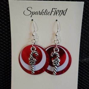 Red & white sequin and silver candy cane earrings. Weight: 0 oz/2 grams each. 2 inches/5 cm from the top of the ear wire. Ear wires are silver plated and nickel-free. Brand new, never worn NWT. Handmade by me, the SparklieFiend!