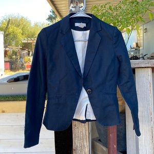 H & M dark blue blazer with one front button. The front pockets are sewed together and there are no other pockets in the jacket. The jacket has shoulder pads inside the material so they can't be removed without cutting the material open. Jacket comes with an extra button. I bought it from someone else but it's to small.