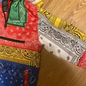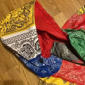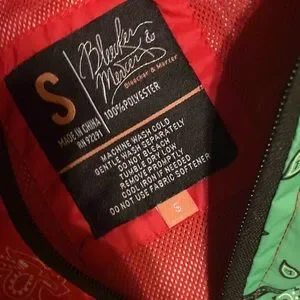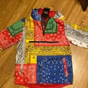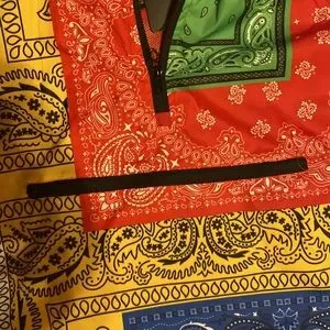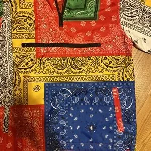 NWT Bleecker & Mercer patchwork printed multicolored 3/4 zippered nylon hooded jacket men size Small; women who normally wear a size large in women sizes can wear this jacket as well in a man Small.