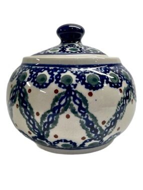 EUC Boleslawiec Polish Pottery Lidded Sugar Bowl-Blue Braided Chain Green Circles