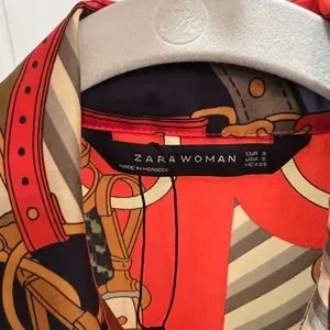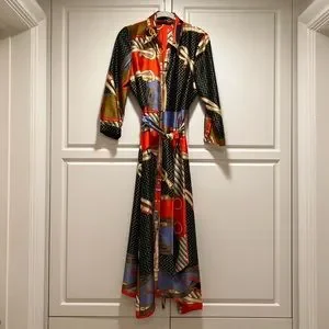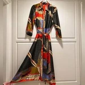 Zara scarf print shirt dress with matching belt. Buttons up the front. Very cute and silky dress.