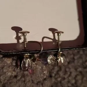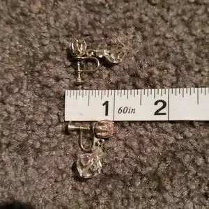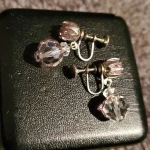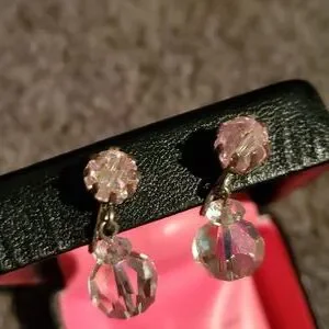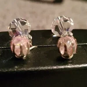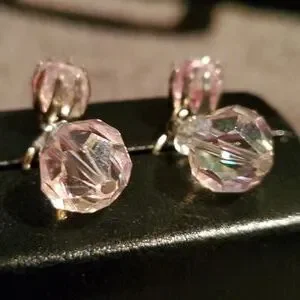 features pink iridescent crystal at top and larger clear iridescent crystal bottom dangle