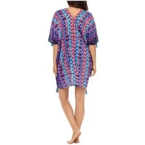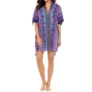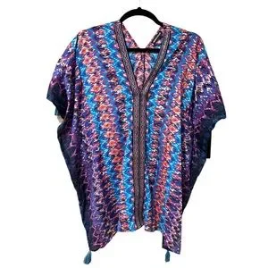 Cover up colorfully in this tassel-decked caftan marked with vibrant embroidery framing the neckline and accenting the front.