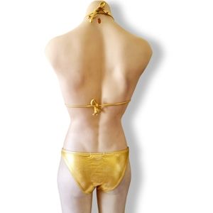 Metallic gold, one piece/monokini swimsuit or bodysuit with rhinestones/ diamontie circle jewel in centre of chest. Triangle, halter top has elasticised ties around neck + back. Removable padding. Cheeky bikini bottoms.