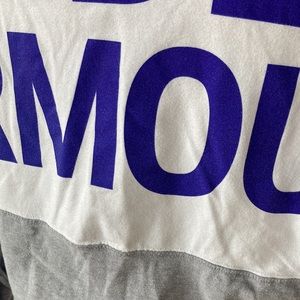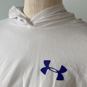 Youth large white Under armour long sleeve shirt with hood. Purple front logo and large purple lettering on back.