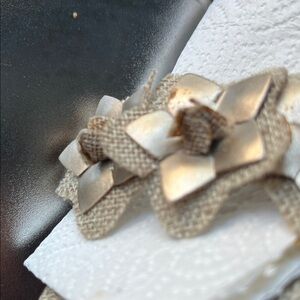 Pale gold metallic trim on strap and around footbed of shoe that matches flowers.