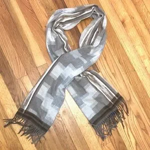 Vintage Cashmink V. Fraas Gray winter scarf with a checkered/aztec print and fringe bottom
