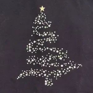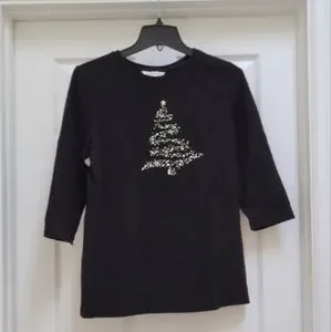 Embellished Christmas tree design w/ green & silver emllishments & gold star on a 3/4 length black shirt.