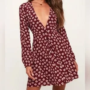 Fleur and Flirtation Burgundy Floral Print Long Sleeve Dress