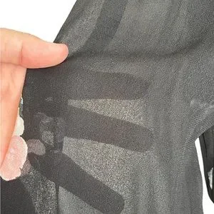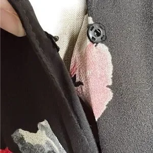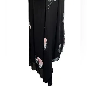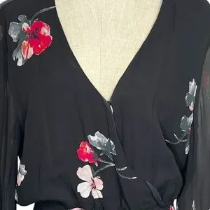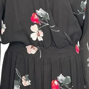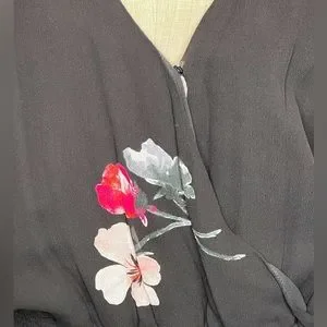Absolutely gorgeous V-Neck black dress with sheer sleeves. The dress is both sexy and sophisticated and can be worn to just about any occasion. The dress pattern is floral, has snap closure in the front and a stretch banded waist that has fantastic give that helps forgive the over-indugent evening you are sure to wear her to. The shirt of the dress is loosely pleated and a-symmetrical being slightly longer on the outer sides.