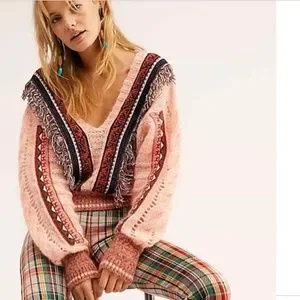 Coral, v-neck, wool, alpaca, fringe boho sweater from Free People. Super cozy and warm!