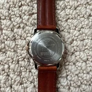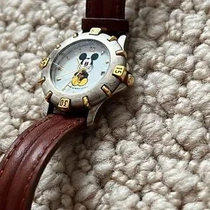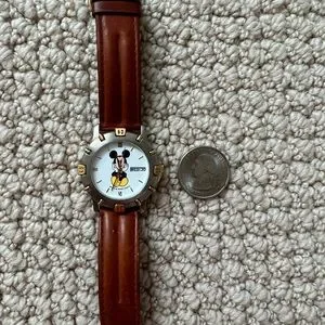 Genuine Mickey Mouse Watch purchased at Disney World. This is the smaller “ladies or child” version. Small scratch on bezel and small scratch on crystal. Please see pictures for details. Battery replaced on 11/1/22. Watch shows day and date and is in excellent working condition. Brown leather band show some wear but can easily be replaced.