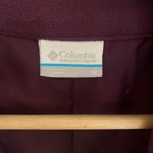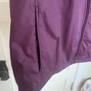 Perfect for layering, this vest is lightweight yet warm. Is has fleece under the arms for increased flexibility. There is also fleece on the inside of the color. Color is a deep plum. There are slip pockets on the outside.