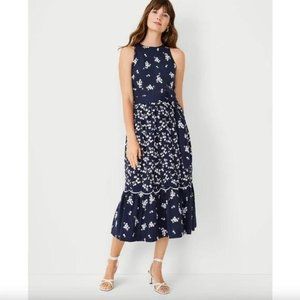 Weave embroidered florals into your wardrobe with this belted midi dress - a season's fresh pick. Jewel neck. Sleeveless. Self tie belt. Hidden back zipper with hook-and-eye closure. Flounce hem. Lined.