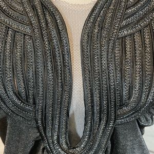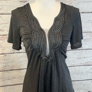 EUC Black top in a stretchy/shimmery fabric. Short fluttery sleeves, draped front and embellished deep cut neckline lined with mesh. Sexy, beautiful top! 93% rayon, 6% spandex, 1% foil. Measures 16" pit to pit and 27" shoulder to hem.