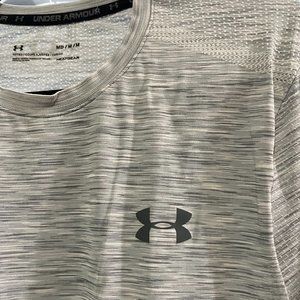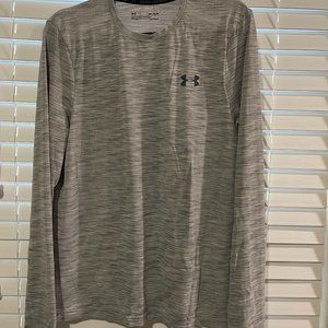 Under Armour Men's Fitted/Heat Gear Crew Neck Long Sleeve Shirt - Heather Gray. Under Armour logo is dark gray.
