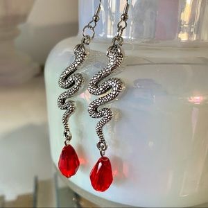 Silver Snake Dangle Earrings Crystal Tear Drop Red Serpent Gothic