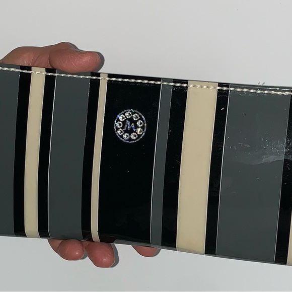 Outer cover with Leather Inner wallet (8 slots for cards (can hold at least 3 cards per slot). Centre opening for cash or receipts. Nine Genuine Swarovski Crystal Branding