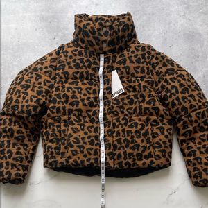 Apparis faux wool puffer coat. Adjustable pull strings along the base of the coat. Slanted welt pockets on the front. Standing collar. Snap button and zipper closure along the front of the coat.
