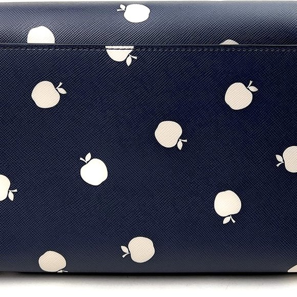 GORGEOUS & NEW! Kate Spade New York Carson Orchard Toss convertible cross body / should bag in blazer blue / navy saffiano pvc with silver chain detailing. PERFECT purse with jeans, shorts, business, beach, skirts, slacks, dress, tank top, t-shirt, leggings, yoga pants, Althleisure, Leisurewear, Y2k look for Spring, Summer, Fall, Winter! Style #k8110. This GORGEOUS quality kate spade handbag has silver tone hardware & kate spade engraved in interior and exterior pinmount logo. Pattern on satchel looks like small white apples! FABULOUS soft blue jacquard interior: 1 slip pocket & credit card slots. Top flap w/ front magnetic close. Flat leather detachable & adjustable cross body strap; silver chains handle. Exterior back slip pocket. All you need for a concert, shopping, school, business, or travel. CLASSY , eye-catching bag n PRISTINE condition. No wear, no stains, no tears, no smells. Smoke free. MSRP: $359, plus tax.