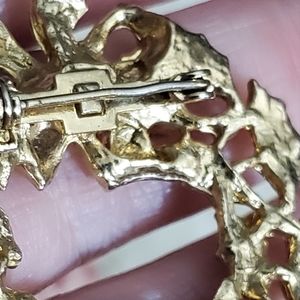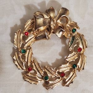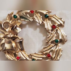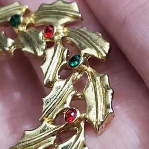 Excellent condition! This is unsigned but is a very well made high quality piece ! This is gold with Holly leaves and red and green crystals, they are small but super sparkly and beautiful, this has a big row ribbon at the top, very elegant. No fading of the gold ,the back pin is bent Slightly see photo. Otherwise super excellent condition !