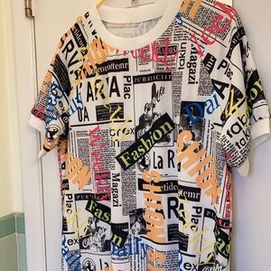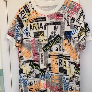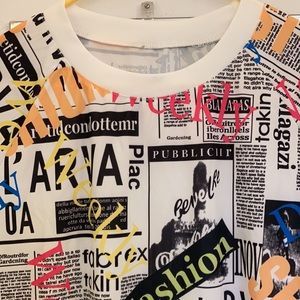 New, never worn newspaper design T-shirt dress. Size L; 22 inches pit to pit; 32 inches pit to hem. 97 percent polyester; 3 percent spandex. Very comfortable