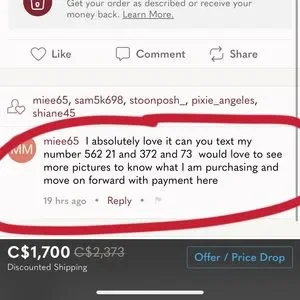 See last 3 pictures: I look this phone number up on google, found that this person/or maybe a team has more than 1 poshmark account, they randomly comment on different listings, but same contact phone number. Please be aware of this ‼️