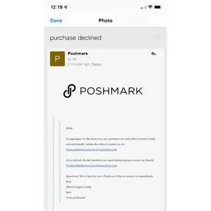 See pic 3&4&5: I texted her, she said she’s ready to buy but there’s a problem with my Poshmark account, so she couldn’t purchase successfully. She sent me a screenshot of email that she received from poshmark, and ask me to email to to solve this problem.