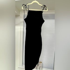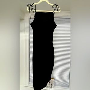Black asymmetrical dress with ruched detailed on the side. Square neckline with adjustable spaghetti straps.🖤