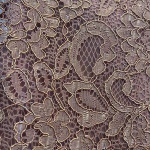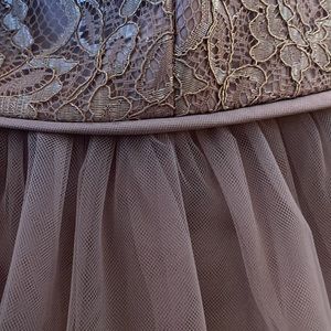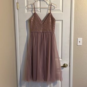 Worn once, unaltered nor flawed. This calf length bridesmaid dress features a metallic rose gold lace bodice, a ribbon-defined waist, and a fluid mesh skirt. Would even make the perfect prom dress!