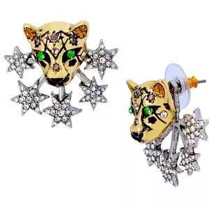 Striking earring jacket featuring ferocious leopard stud at front and celestial starburst at back adorned with glistening stone accents.