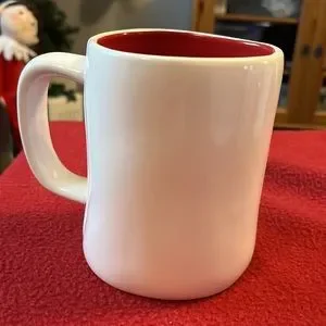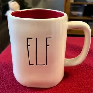 Rae Dunn ELF mug white with black writing and red interior
