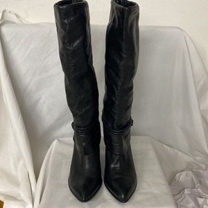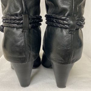 Beautiful black leather with 3 braided leather straps. Comfortable 3.5” heel. Worn once, no signs of wear.