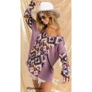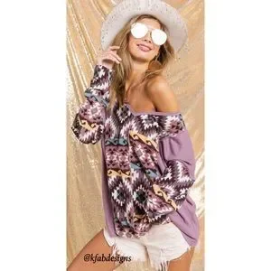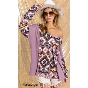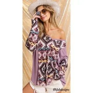 ❤️NEW! V Neck Mauve/Lilac Mix Aztec Print Soft Color Block Top