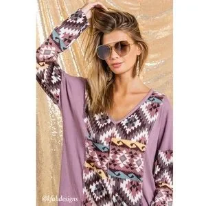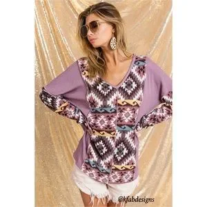 LAST 1! V Neck Mauve/Lilac Mix Aztec Print Soft Color Block Top