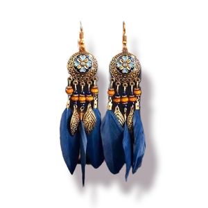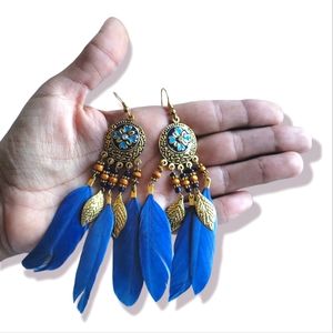 Hand Crafted Artsy Boho Long Blue Feather Leaves Beaded Dangle Drop Earrings