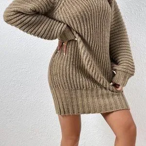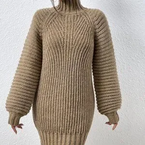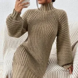 Preppy Womens Elegant High Neck Raglan Sleeve Sweater Dress