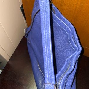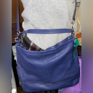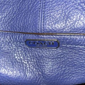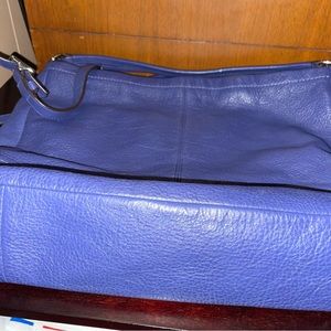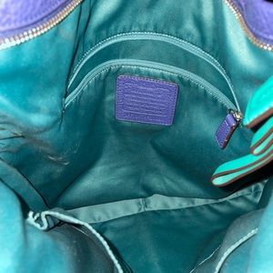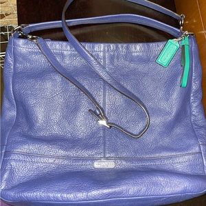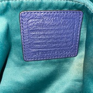 Large size Coach purse supple leather deep periwinkle blue color with emerald green satin-like lining. No rips or tears. Can be worn 3 ways, handbag/crossbody or shoulder bag. Removable strap. 3 inner pocket one w/zipper. Main zipper✔️. Comes with free gift: matching green Coach wristlet. Gorgeous bag for all seasons.