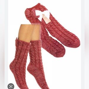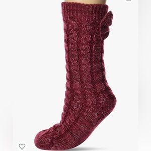 Chunky cables texture the exterior of these cozy crew socks enhanced by bow-set cuffs and plush fleece lining.