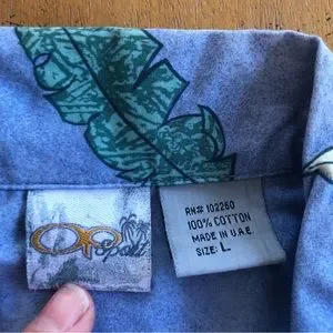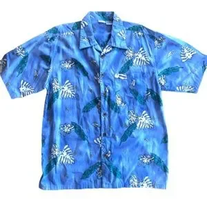 Men's large short sleeve Hawaiian shirt in light blue, green and white. Palm leaves, tie dye look. Full button and collar. Excellent condition, see measurements in photos. Polynesian. OP Ocean Pacific, 100% cotton.