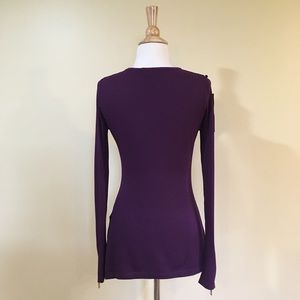 A deep aubergine purple sweater top with zippered detailing at the cuffs and side slits. Stretchy, fitted silhouette.