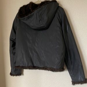 Faux Fur Reversible Jacket. Would suggest the size is M. Beautiful dark black/brown faux fur coat. Reversible side is simple and black and can be worn like a rain coat. Adorable hoodie feature. Zipper has some ware in coloring but fully functional.