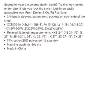 This cute turquoise Jean jacket has just the right pop of color. In good used condition. Worn and laundered with care. QVC item number A223022. Size is small, but easily fits like medium. See measurements. Color is bright like the first pictures, not like color in measurement pics.