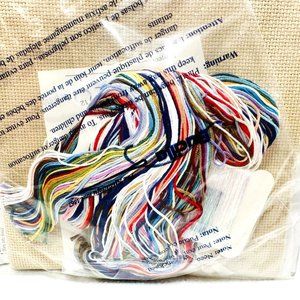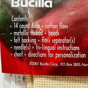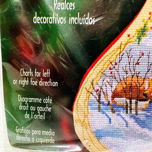 Kit contains: 14-count Aida, cotton floss, metallic thread, beads, felt backing, floss separator, needle, trilingual instructions, chart, directions for personalization. The kit is in new/sealed condition. Stocking measures 18 inches.