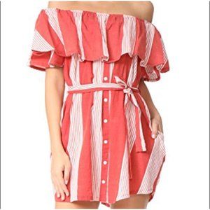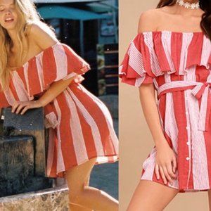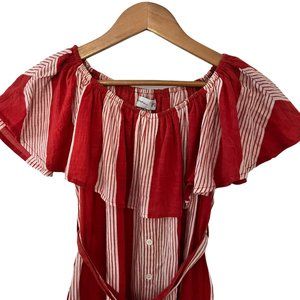 The Faithfull the Brand Amalfi Rust Red Striped Dress has us in the mood for a picnic! Lightweight woven cotton, in a cream and rust red striped pattern, shapes an elasticized off-the-shoulder neckline and flounce bodice. Decorative button placket and tying waist sash. Side seam pockets. As Seen On Racquel of @racquelnatasha and Whitney of @whitneybearr!