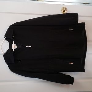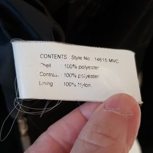 this coat is in very good condition. it is polyester with a lining, all the zippers work perfectly, and it has a detachable hood. measurements are 23 1/2 armpit, 28 length.