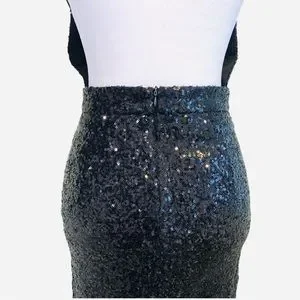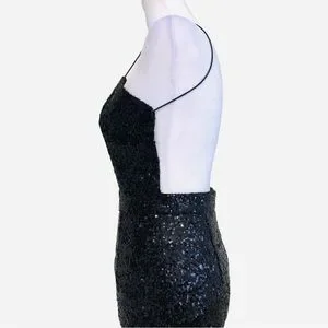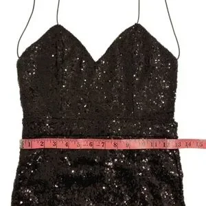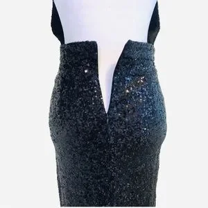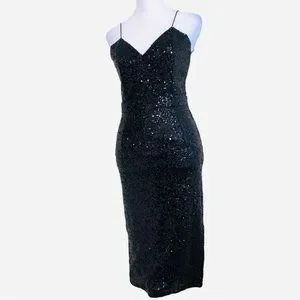 Rehab Sequin Dress in Black, on trend with the "nearly naked" style. Backless, spaghetti strap, midi length. Invisible back zip, back hem slit, fully lined. Darts in bodice & waistline for a perfect fit. This dress is beautifully constructed with a gorgeous all over black sequin sparkle. Sexy, Seductive, Daring, Empowering, Bold, Glamorous...and so much fun to wear!!!