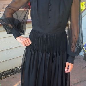 Beautiful 1970s vintage party/coktail dress in black chiffon and full satin lining. Sheer sleeves, covered buttons on cuffs, pleated below waist to hip, full skirt. Perfect for ballroom dancing. Purchased in England, no tags. Fits modern size 6 to 8. 38” pit to pit, 41.5” from back of neck, sleeves 22” from underarm. Excellent condition, no flaws.