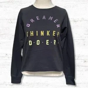 Crew neck sweatshirt with rolled bottom hem edge and inspirational graphic on front. Color is bluish gray. Never worn, new with tags.