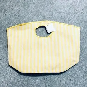 Yellow and white striped tote bag with cutout handle made of a woven straw material. Fully lined inside with a pocket and the Shiraleah tag. It’s roomy size, approximately 24”x17”x9”. Brand new with tags, retails for $60